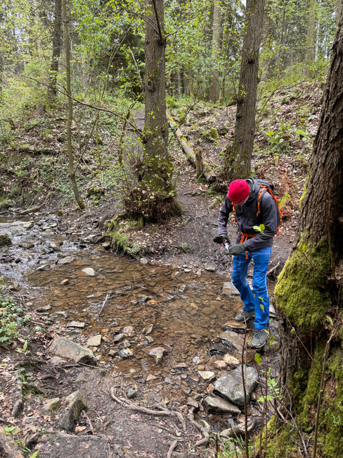 Fast 1,5 h folgen wir einer unspektakulären Waldautobahn nach der anderen! Wir laufen bergab. Etwas weg vom Weg fließt ein Bach, den man aber nur zu Gesicht bekommt, wenn man mal einen kleinen Abstecher weg vom Hauptweg macht.